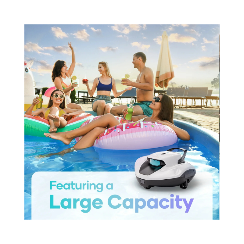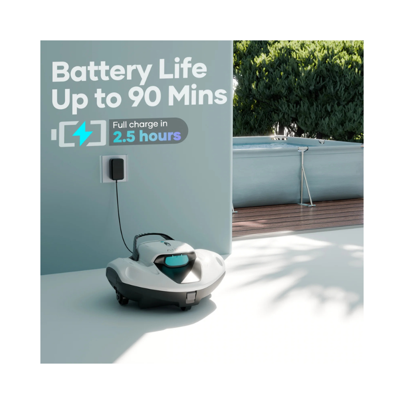 A nova bateria recarrega em apenas 2,5 horas e proporciona mais de 90 minutos de limpeza contínua – ideal para piscinas acima do solo de até 860 pés².