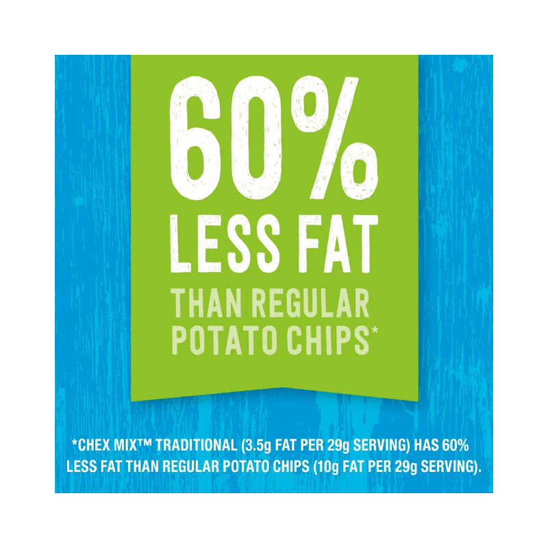 O Chex Mix oferece uma combinação deliciosamente imprevisível de formas, sabores e texturas em cada punhado. Cada porção contém 60% menos gordura do que as batatas fritas comuns.