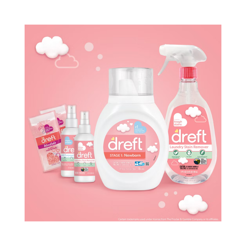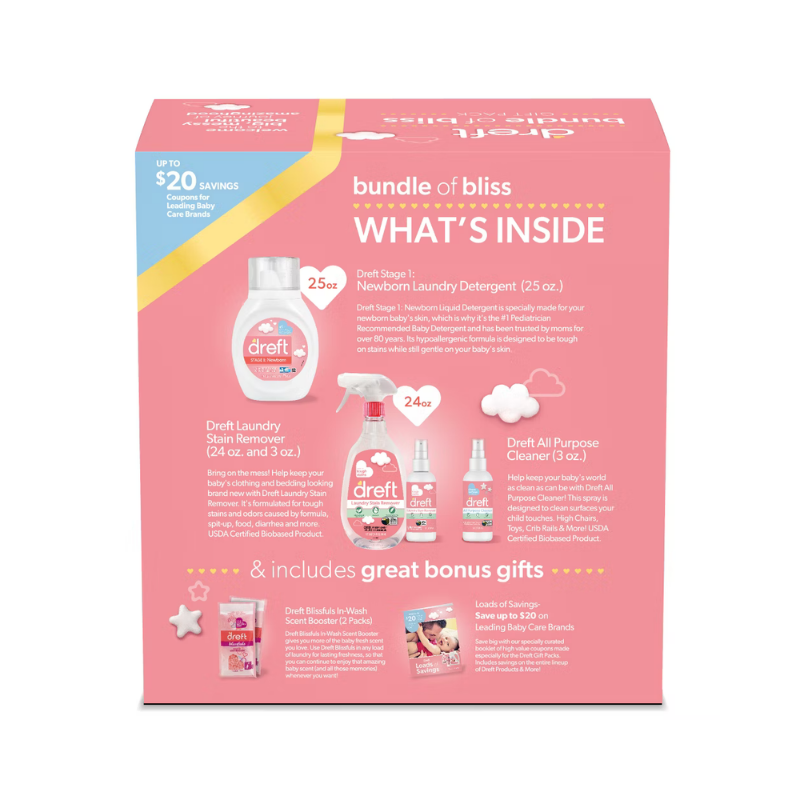 Bem-vindo à grande e bagunçada jornada linda da maternidade. O que está incluído: Detergente para roupas Dreft Stage 1: Recém-nascido. O detergente líquido Dreft Stage 1: Recém-nascido é especialmente formulado para a pele do seu bebê recém-nascido, por isso é o Detergente para Bebês mais recomendado por pediatras e confiado por mães há mais de 80 anos. Sua fórmula hipoalergênica é projetada para ser eficaz contra manchas, enquanto ainda é suave na pele do seu bebê. Removedor de Manchas para Roupas Dref. Pode trazer a bagunça! Ajude a manter as roupas e a roupa de cama do seu bebê com aparência de novas com o Removedor de Manchas Dreft. É formulado para manchas e odores difíceis causados por fórmula, regurgitação, comida, diarreia e mais. Produto Biobaseado Certificado pelo USDA. Limpador Multiuso Dreft. Ajude a manter o mundo do seu bebê o mais limpo possível com o Limpador Multiuso Dreft! Este spray é projetado para limpar superfícies que seu filho toca: cadeirinhas, brinquedos, grades do berço e mais! Produto Biobaseado Certificado pelo USDA. Dreft Blissfuls In-Wash Scent Booster. Dreft Blissfuls In-Wash Scent Booster oferece mais do cheiro fresco de bebê que você ama. Use Dreft Blissfuls em qualquer carga de roupa para uma frescura duradoura, para que você possa continuar a desfrutar daquele incrível cheiro de bebê (e todas essas memórias) sempre que quiser!