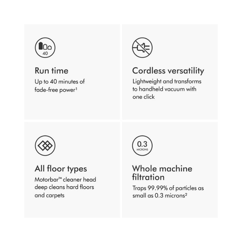 O Dyson Digital Slim™ combina leveza e potência, sendo 33% mais leve que o Dyson V11™ e oferecendo até 40 minutos de sucção sem perda de desempenho. Projetado para lares com pets, possui filtragem avançada que captura 99,99% das partículas pequenas e libera ar limpo. A cabeça Motorbar™ limpa profundamente todos os tipos de piso, desembaraçando cabelos e pelos durante o uso.
