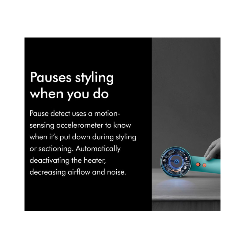 Detecção de Pausa: Equipado com um acelerômetro que detecta quando o secador é colocado em repouso durante a estilização, desativando automaticamente o calor e reduzindo o fluxo de ar e o ruído. Ao ser retomado, retorna às configurações originais.