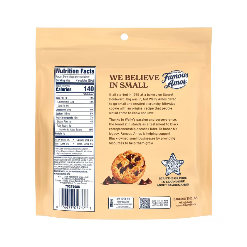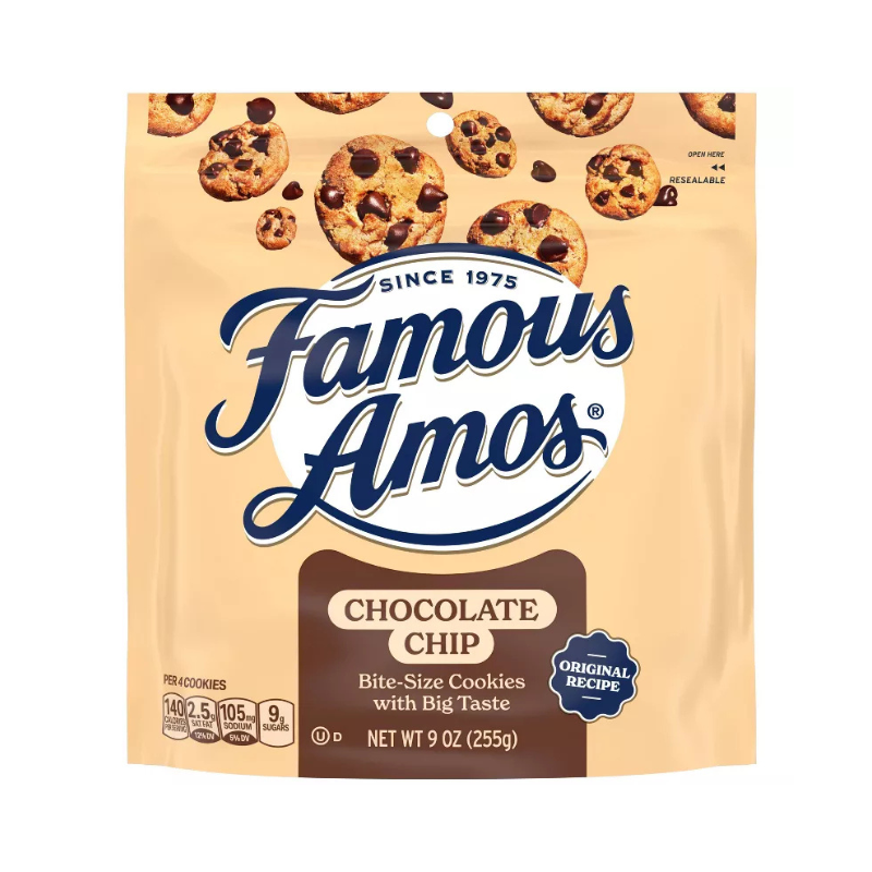 Delicie-se com os icônicos biscoitos Famous Amos com gotas de chocolate, agora em um prático pacote de 9oz. Feitos com ingredientes premium, esses biscoitos crocantes são perfeitos para qualquer momento do dia. Cada mordida oferece o sabor clássico e irresistível de chocolate, tornando-os um lanche ideal para compartilhar com amigos e familiares, ou para curtir sozinho. Ótimos para levar na bolsa, incluir na lancheira ou saborear com um café ou chá!