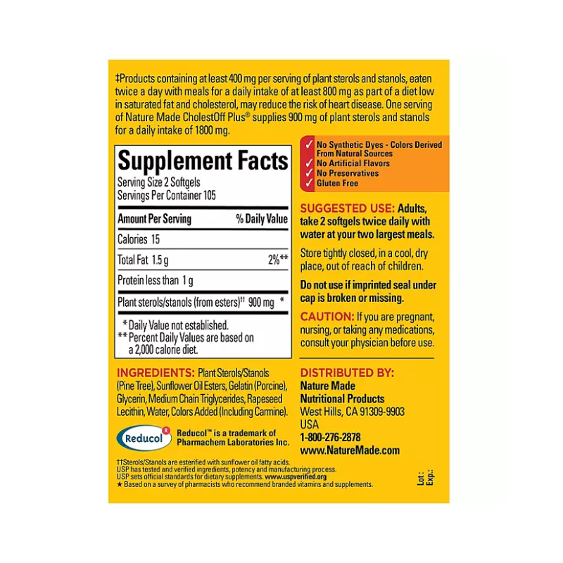 Nature Made CholestOff Plus Softgels, O Nature Made CholestOff Plus é um suplemento que ajuda a reduzir o colesterol, promovendo a saúde do coração. Com 1800 mg diários de fitoesteróis e estanóis vegetais, ele reduz a absorção de colesterol no sangue quando consumido com refeições. Produzido com padrões de qualidade verificados pela USP, é confiável e recomendado por farmacêuticos.