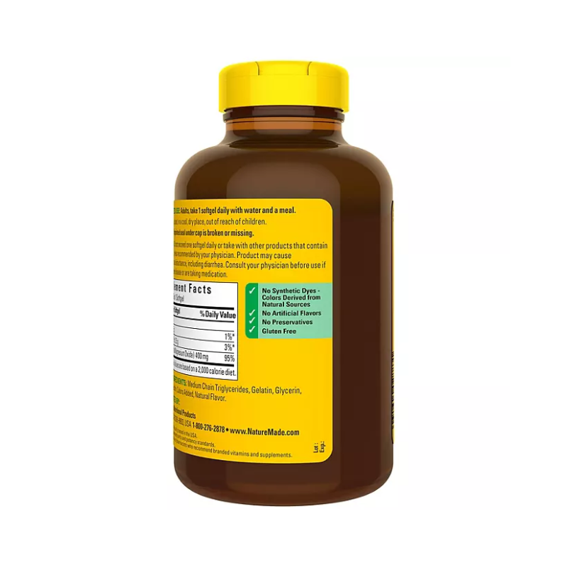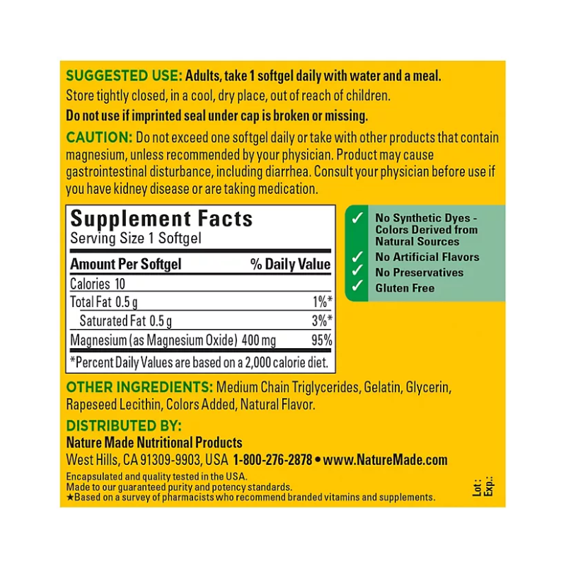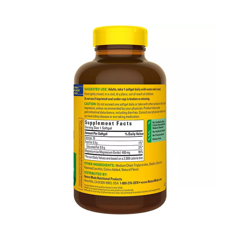 Nature Made Magnesium Oxide 400mg Softgels, O suplemento Nature Made Extra Strength Magnesium Oxide 400 mg em cápsulas auxilia na saúde muscular, nervosa, cardíaca e óssea, além de converter alimentos em energia celular. Com ingredientes de alta qualidade, é livre de glúten, corantes sintéticos, sabores artificiais e conservantes. O magnésio, presente naturalmente em alimentos como leguminosas, nozes, sementes e iogurte, participa de mais de 300 reações metabólicas no corpo, regulando funções musculares e mantendo a densidade óssea. Mais de 50% dos adultos americanos não consomem magnésio suficiente, tornando a suplementação essencial. A dose diária recomendada é de 400–420 mg para homens e 310–320 mg para mulheres. Recomenda-se tomar uma cápsula ao dia com água e uma refeição.