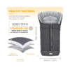 Possui tiras refletivas e cinco aberturas para cinto de segurança, compatíveis com a maioria dos carrinhos. Seu sistema antideslizante garante maior segurança, contando com partículas antiderrapantes no verso, painel superior ajustável e tiras para fixação ao carrinho. O design inteligente também inclui capuz com cordão ajustável e zíperes cobertos para evitar entrada de vento ou machucados no queixo do bebê.