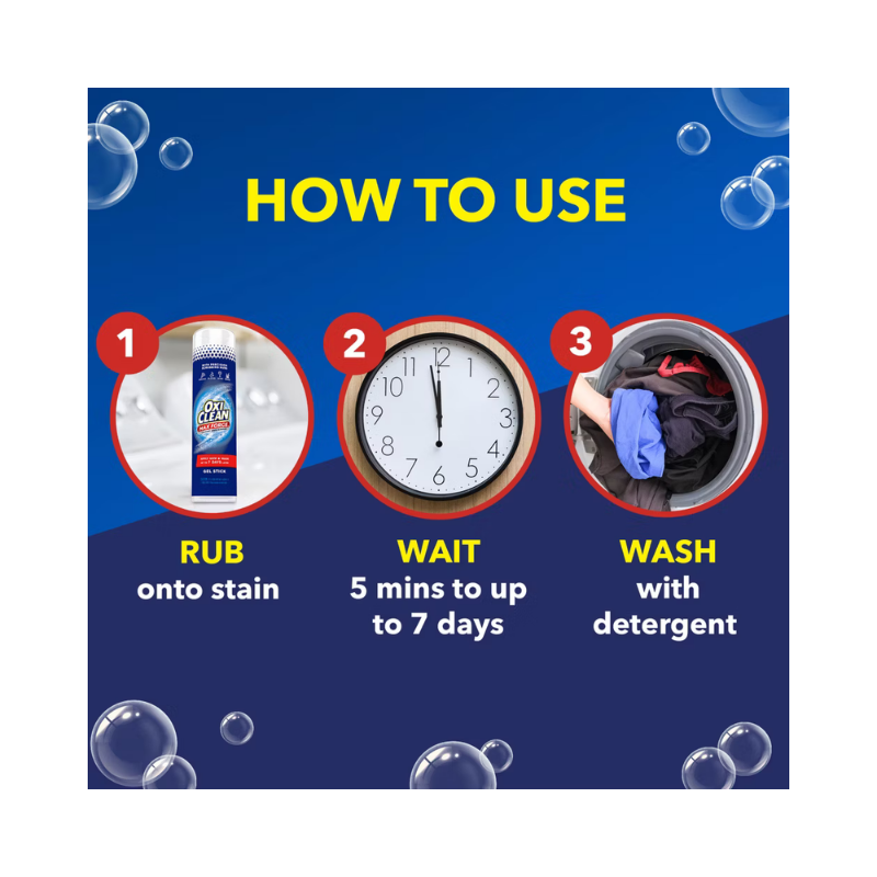 Aproveite o poder do oxigênio para remover manchas difíceis com o Bastão em Gel para Remoção de Manchas de Roupas OxiClean Max Force. Esse gel de remoção de manchas permite que você faça a lavanderia no seu ritmo—aplique e aguarde cinco minutos ou até sete dias antes de lavar. O gel ultraconcentrado utiliza nódulos de esfrega para penetrar profundamente nas fibras da roupa, quebrando e ajudando a remover manchas difíceis já impregnadas na primeira aplicação, como grama, óleo, gordura, comida, vinho, sujeira, tinta, sangue, maquiagem, e manchas de roupas infantis e de bebês. Use este removedor de manchas livre de cloro, seguro para cores e sem corantes em todas as roupas, lençóis e toalhas laváveis na máquina, tanto brancas quanto coloridas. Ajude a manter tênis brancos, remova gordura de pizza da sua camisa favorita, e use como removedor de manchas para roupas de bebês e peças herdadas entre crianças. Esfregue o gel diretamente nas manchas até saturá-las, deixe agir por cinco minutos ou até sete dias, depois lave na temperatura mais quente que o tecido suportar. Para melhores resultados, pré-trate as manchas o mais cedo possível. Tenha sempre o prático bastão de gel de 183 ml em casa para estar preparado para os imprevistos.