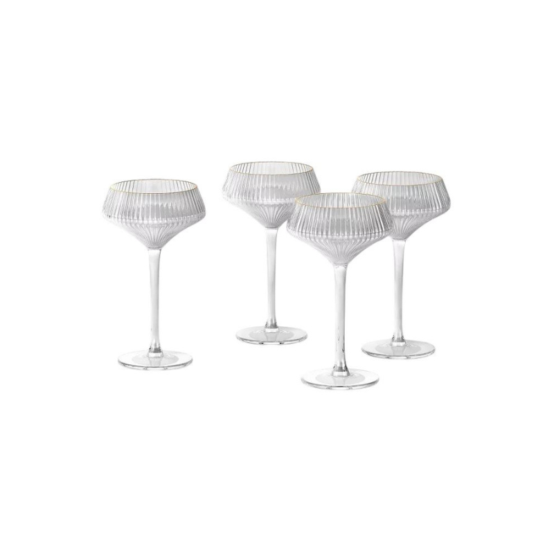 O Conjunto de 4 Taças Coupe Caneladas da Threshold™ combina elegância e funcionalidade, com textura canelada e bordas douradas. Cada taça possui capacidade de 190 ml, perfeita para vinhos e coquetéis frios, ideal para eventos especiais.